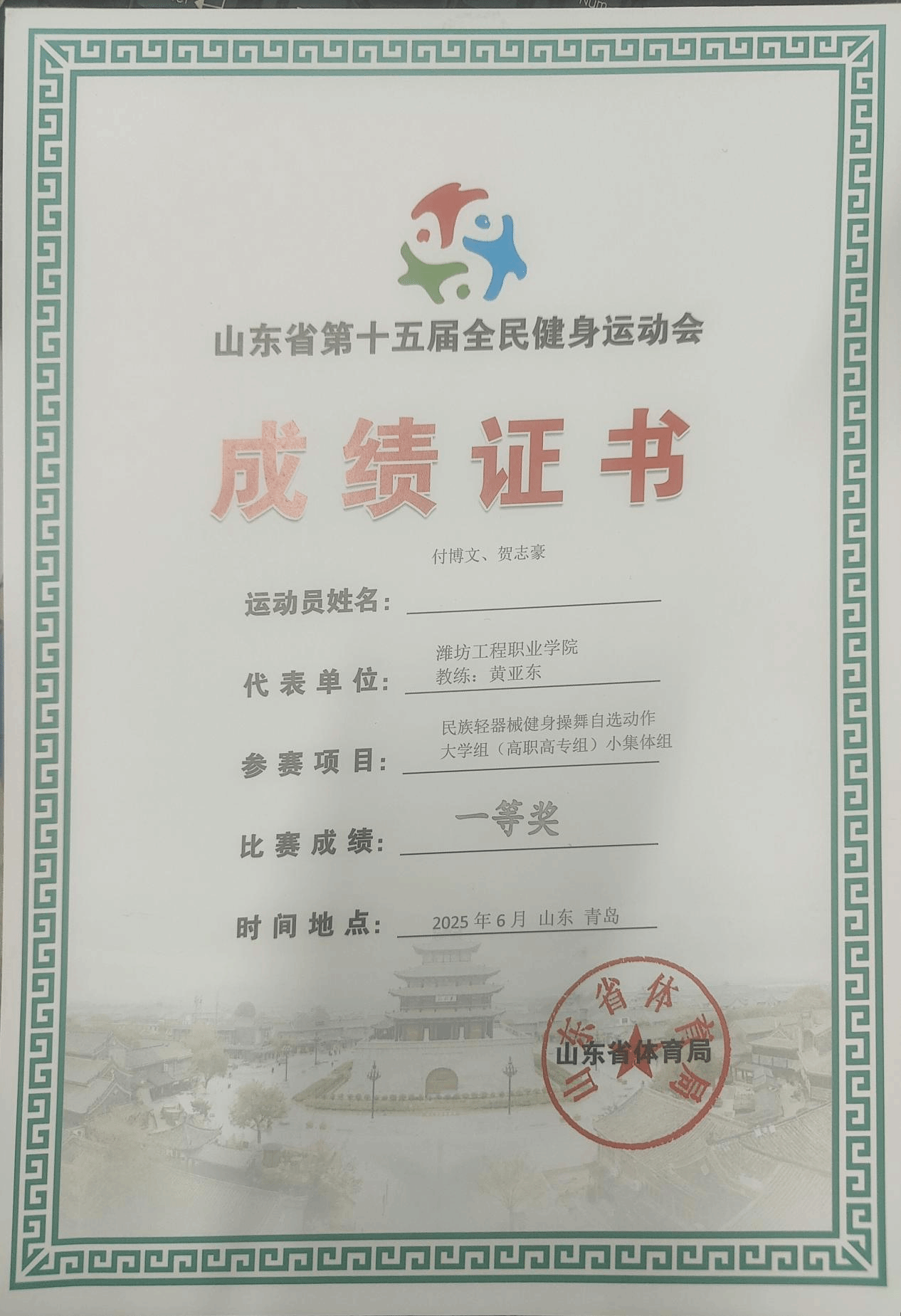 近日,山东省第十五届全民健身运动会在青岛奥体中心圆满举办。本次赛事由山东省体育局主办,汇聚全省众多运动健儿同台竞技,展现全民健身热潮下的体育风采与拼搏精神。凤凰艺术学院积极响应赛事号召,选派优秀学子参赛,在王凯、黄亚东两位老师的悉心指导与全力护航下,学子们刻苦备赛、精益求精,全力冲击两个赛项的荣誉。